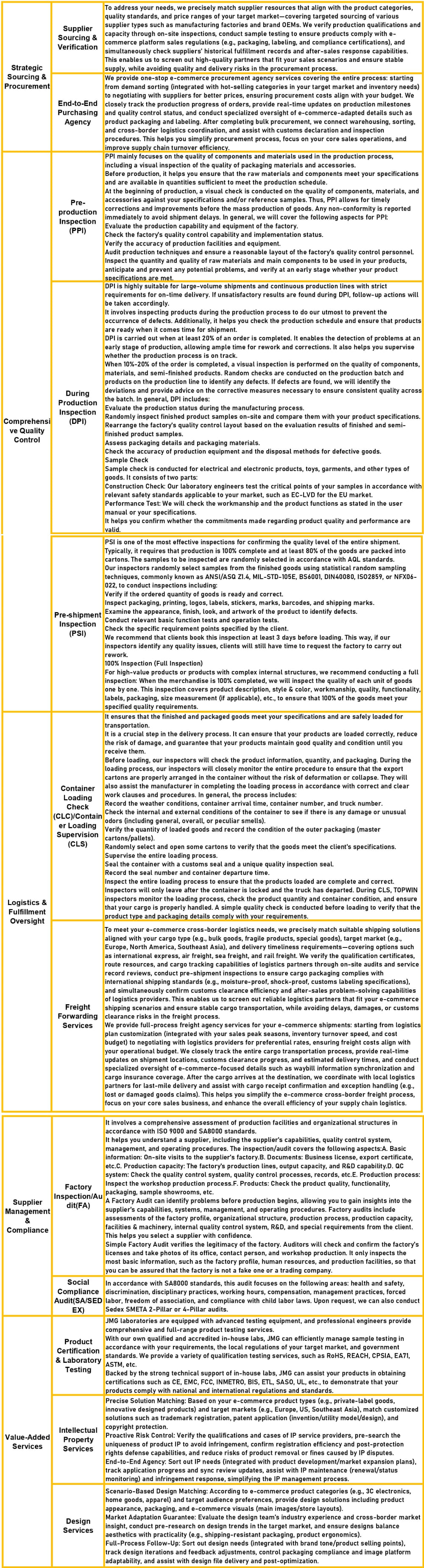 For high-value products or products with complex internal structures, we recommend conducting a full inspection: When the merchandise is 100% completed, we will inspect the quality of each unit of goods one by one. This inspection covers product description, style & color, workmanship, quality, functionality, labels, packaging, size measurement (if applicable), etc., to ensure that 100% of the goods meet your specified quality requirements.